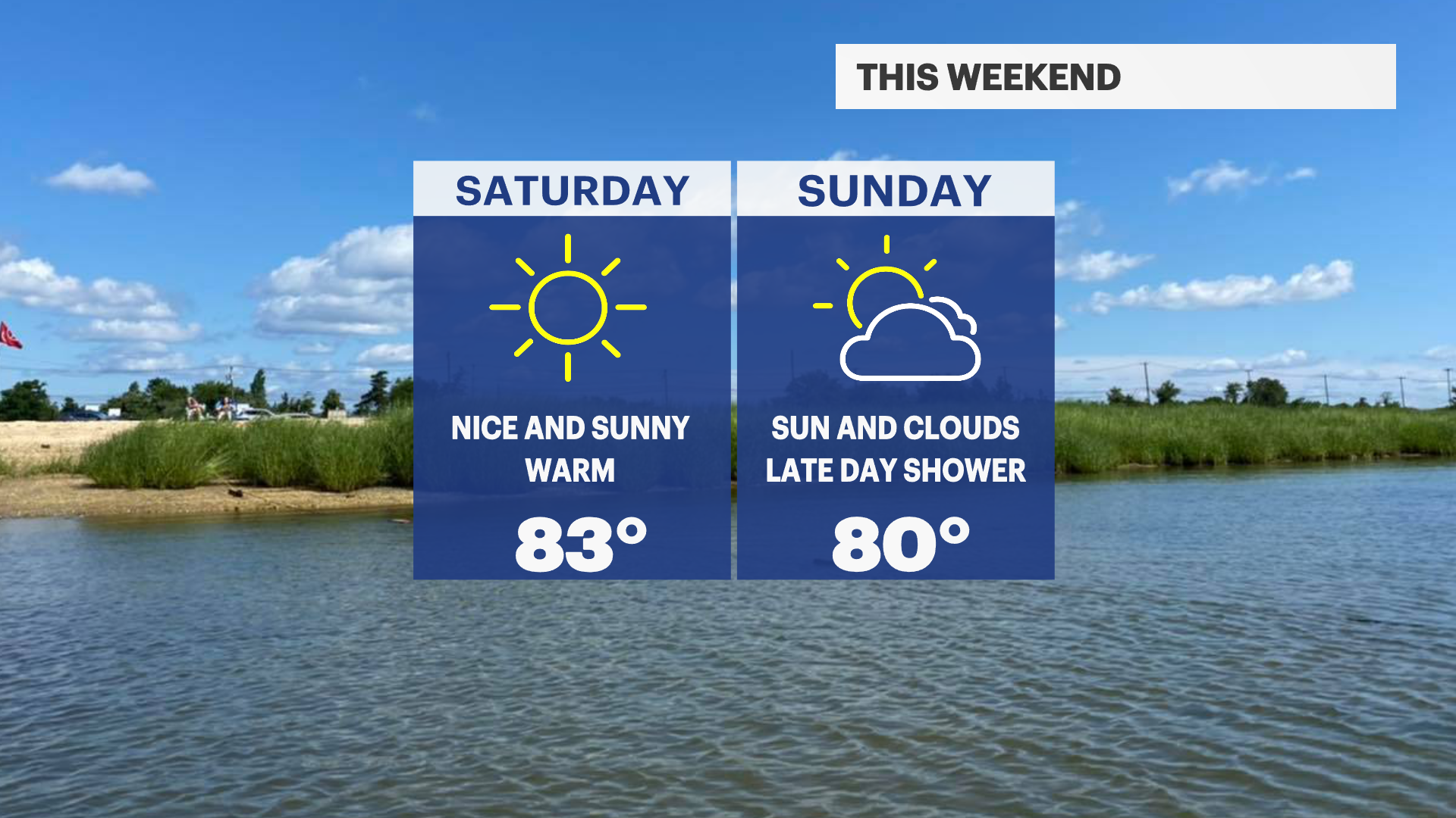 SUNDAY: Nice with sun and clouds. Chance for a few showers by the evening with a better chance for rain overnight. Highs near 80. Lows near 68.
