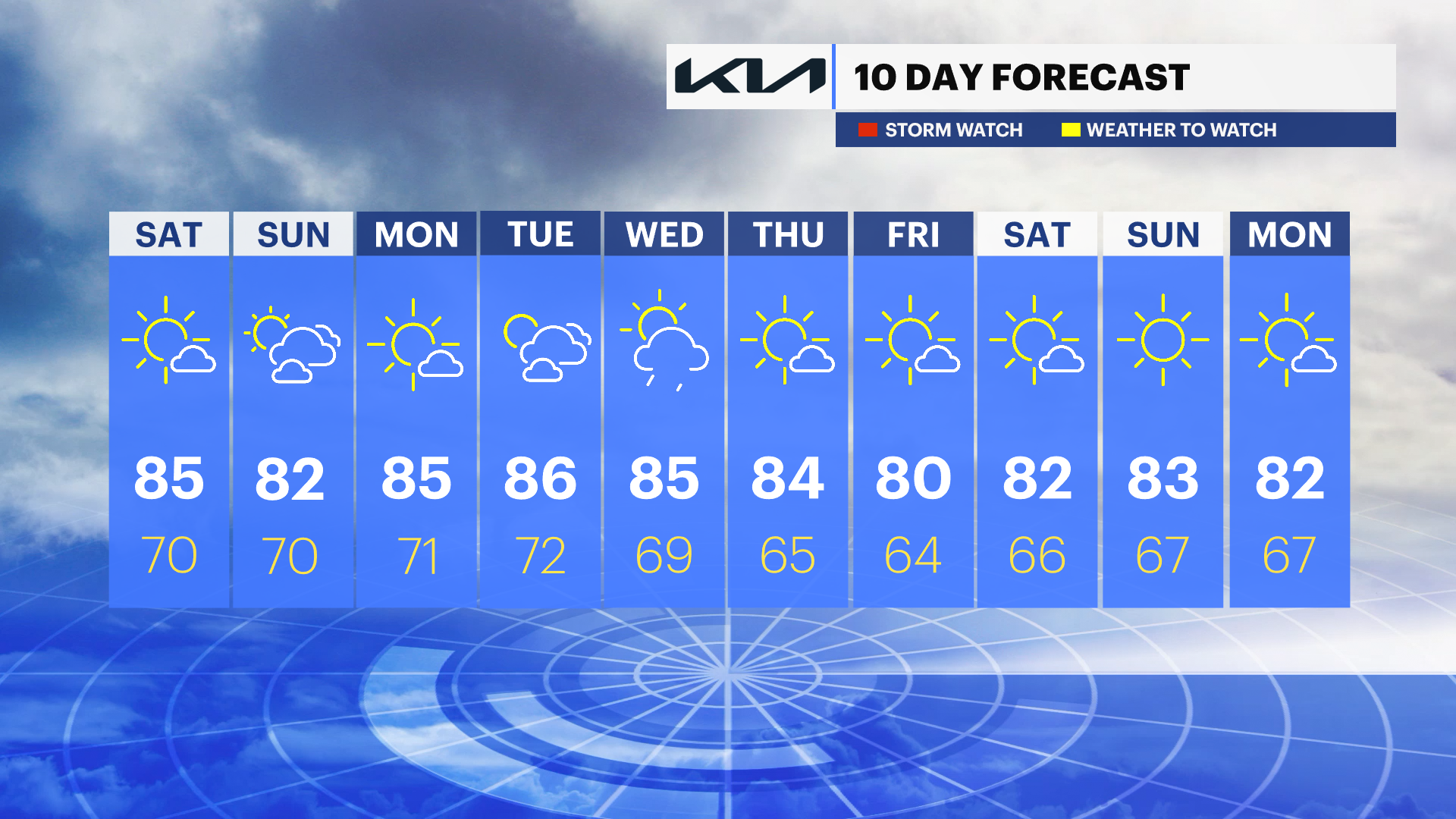 WEDNESDAY: Slight chance of a shower or storm with sun and clouds. Highs near 85. Lows near 69.