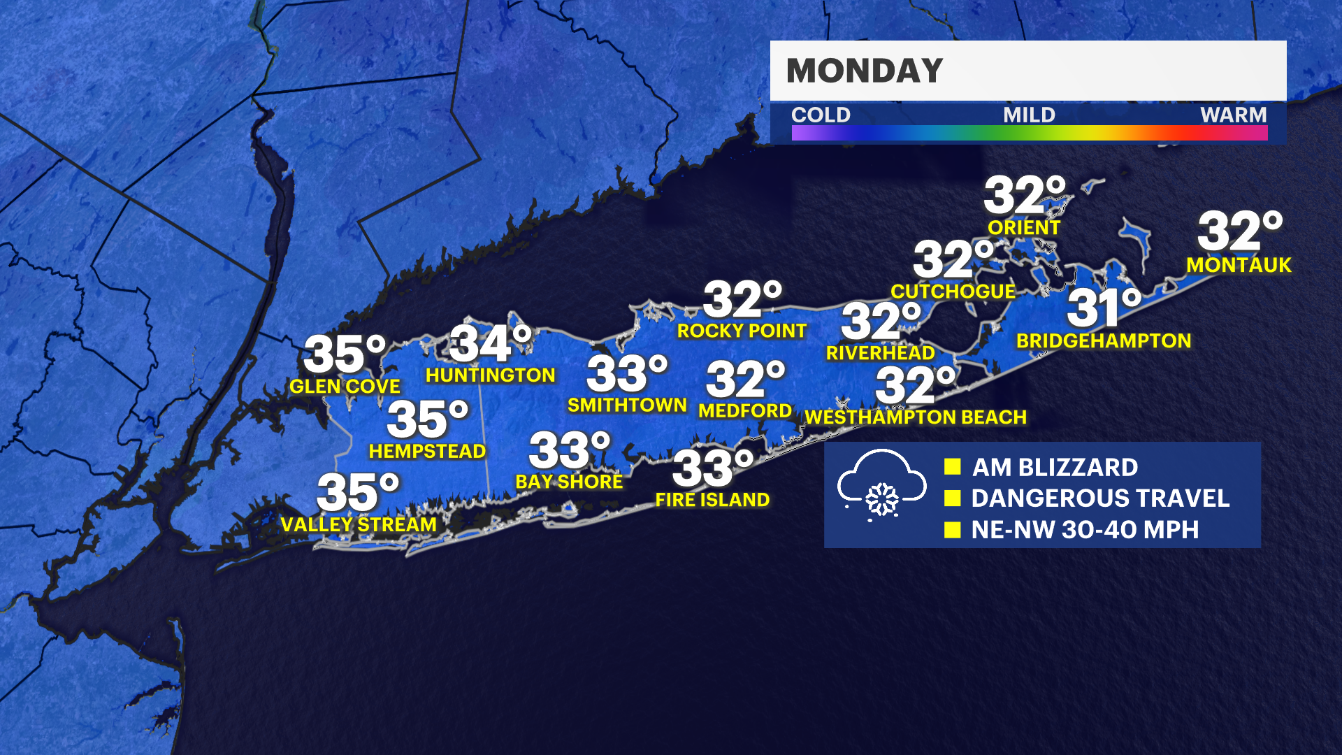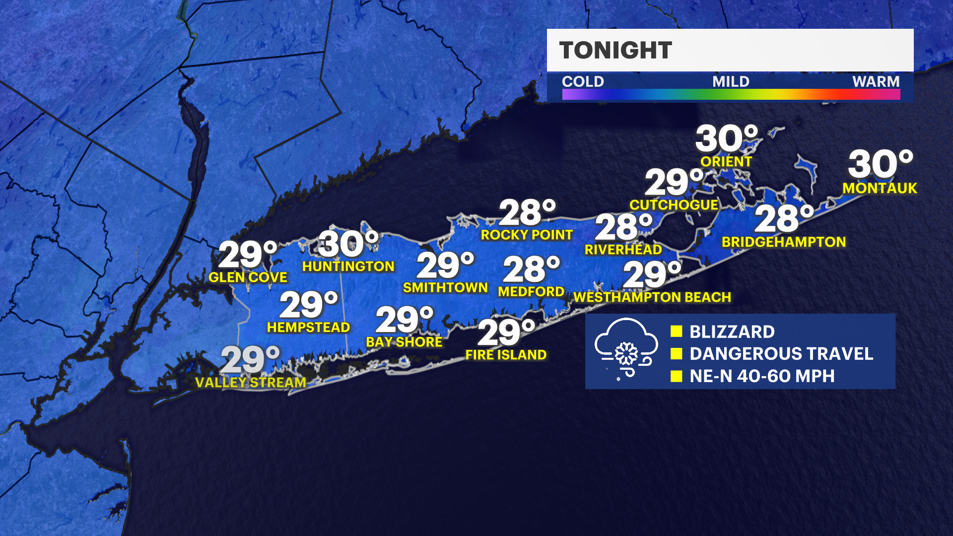 Sunday night: Blizzard conditions. Snow, heavy at times. Areas of blowing snow. Dangerous travel. Stay off the roads. Lows 28 to 32. Wind chill values between 15 and 20. Windy with a northeast wind 25 to 35 mph. Winds could gust as high as 55 mph, some gusts over the East End could be 60 to 70 mph. Power outages likely. New snow accumulation of 13 to 19 inches possible. Coastal Flood Warning from 10 p.m. to 4 a.m. Move your cars in anticipation of potential moderate to major flooding.
