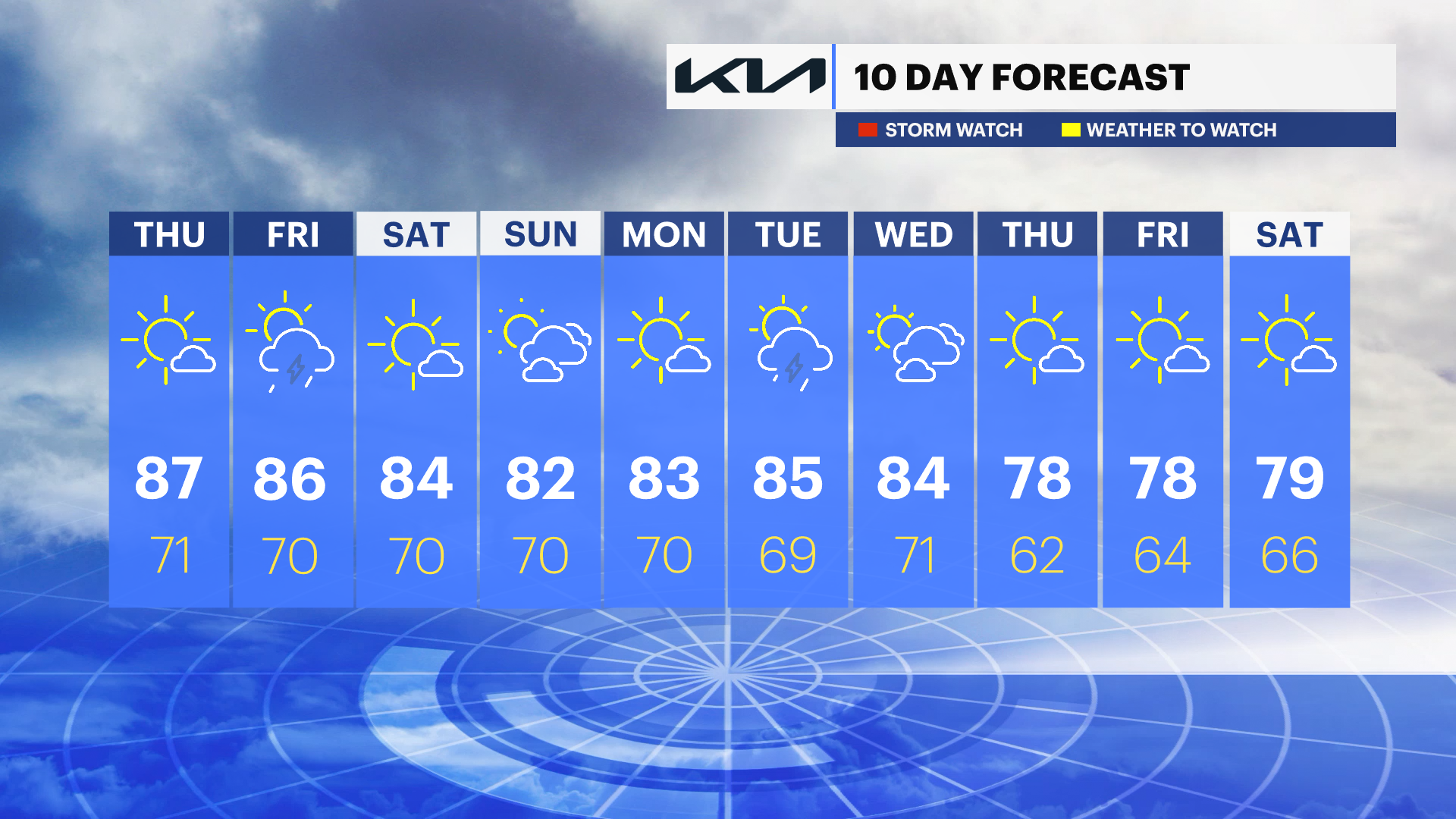 SUNDAY: Mostly sunny and nice. Highs near 82. Lows near 70.