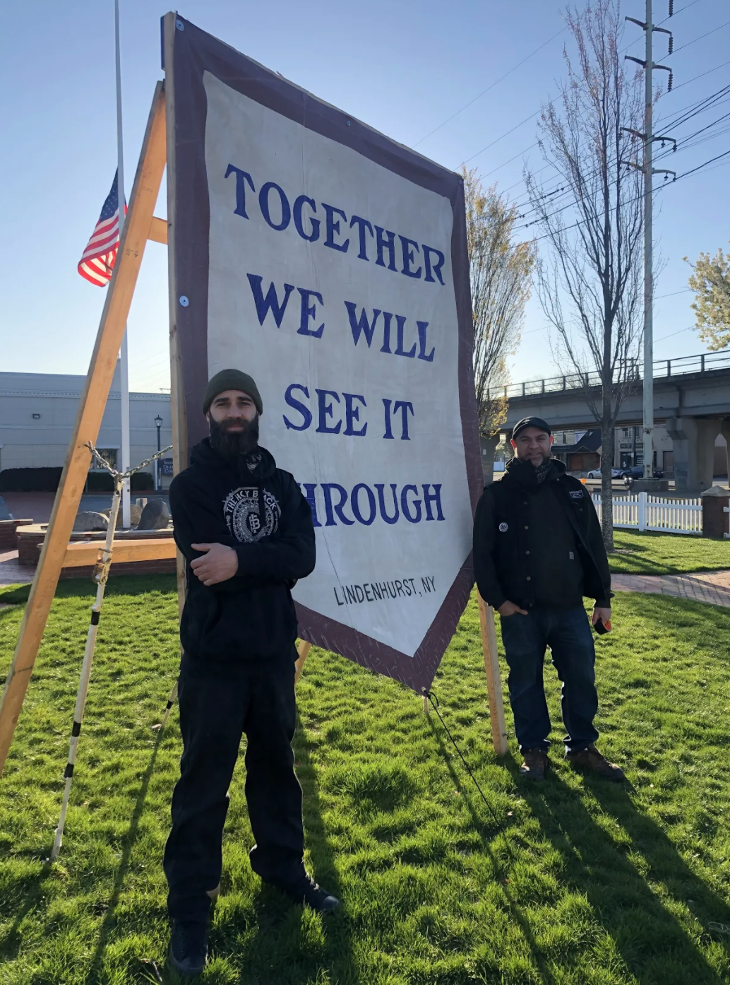 The massive banner reads Together We Will See It Through. It was built and erected by The Holy Black, a men's product company specializing in old-school barber products started by Matty and Stefan Gaudio - brothers who grew up in Lindenhurst Village and recently moved their shop and warehouse there.