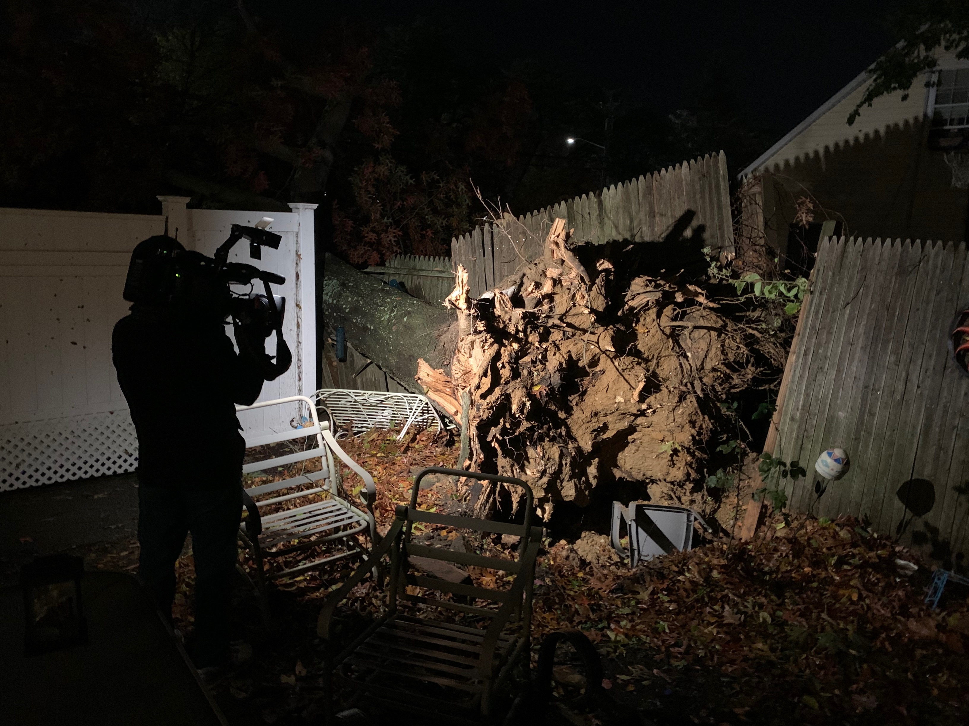 A massive tree slammed into one Rockville Centre home, knocked over the chimney and took down a few power lines. Sparks from the live wires ignited a small fire in the front yard.