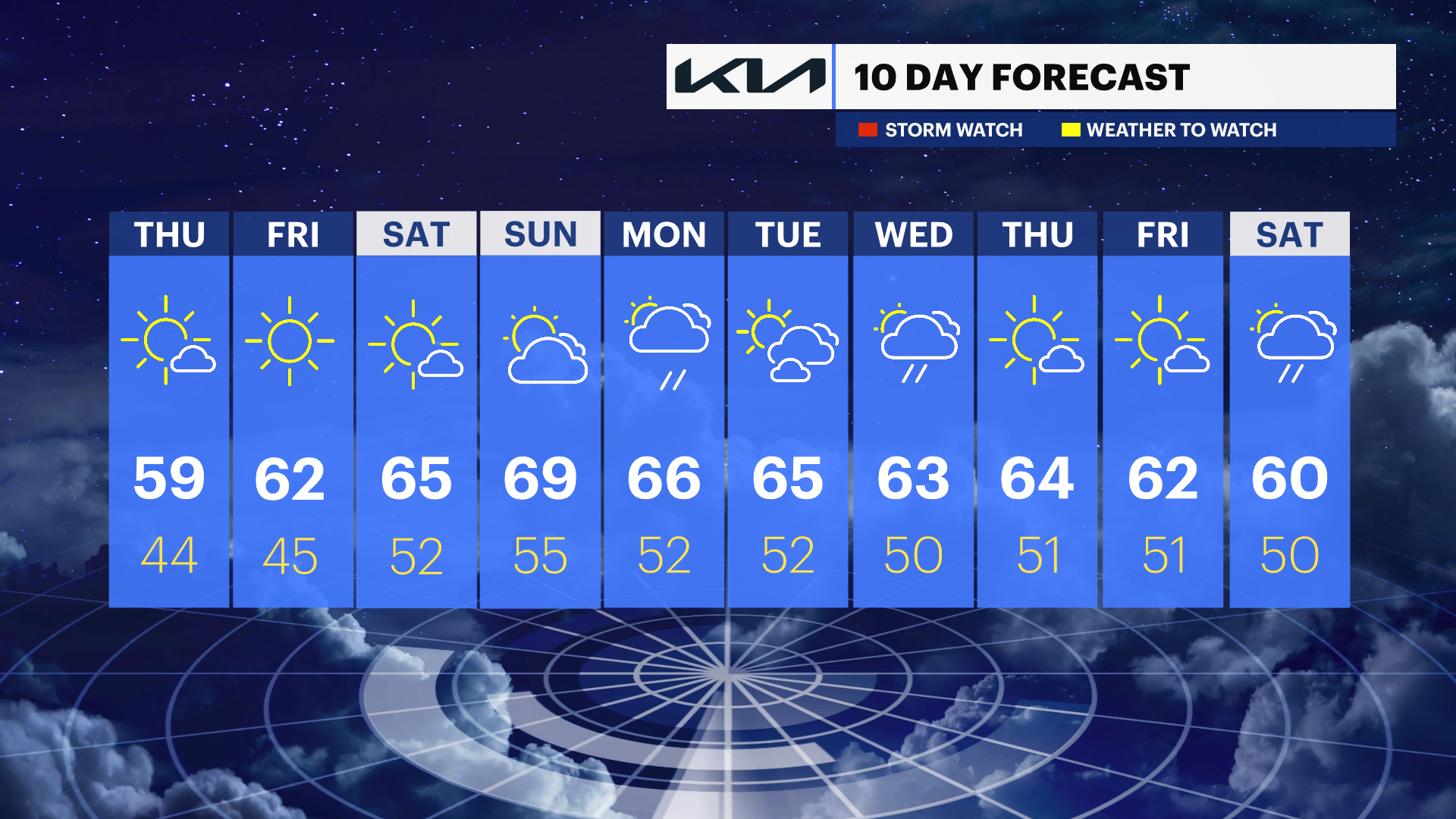 FRIDAY: Sunny and breezy with high temperatures around 62 degrees. Lows near 45 degrees. SATURDAY: Mainly sunny to partly cloudy. Highs around 65 degrees. Lows near 52 degrees. SUNDAY: Increasing clouds. A few showers may arrive at night. Highs around 69 degrees. Lows near 55 degrees. MONDAY: Our next best chance for rain. At this point, it looks like a light to moderate scattered rain. Highs around 66 degrees. Lows near 52 degrees.