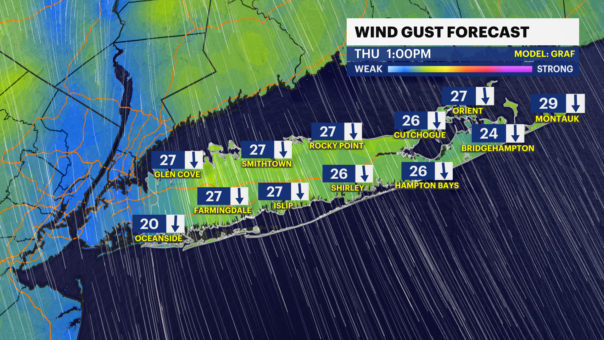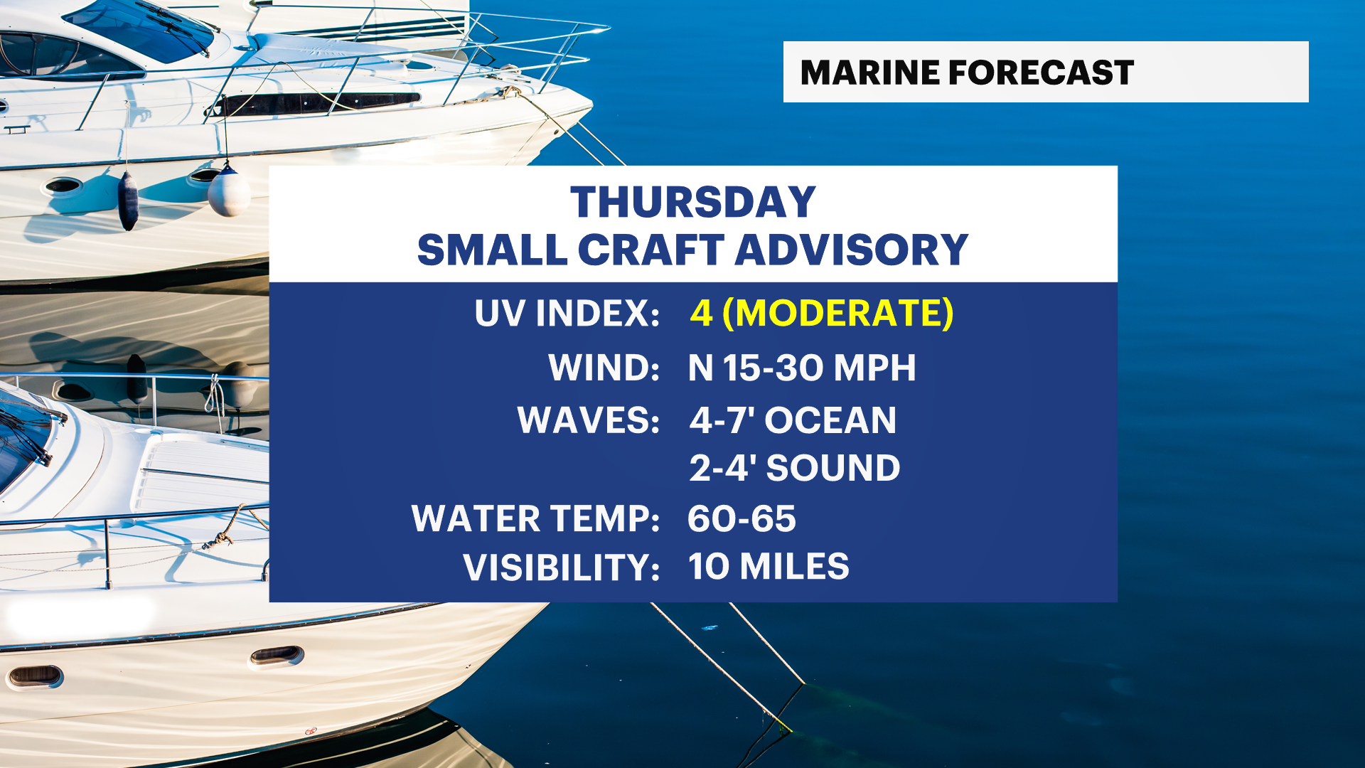 THURSDAY: Mostly sunny to partly cloudy, a bit windy and cooler with highs only around 59 degrees. It will feel like the mid-50s at best. Wind: north-northwest 15 to 30 mph. Lows near 44 degrees.