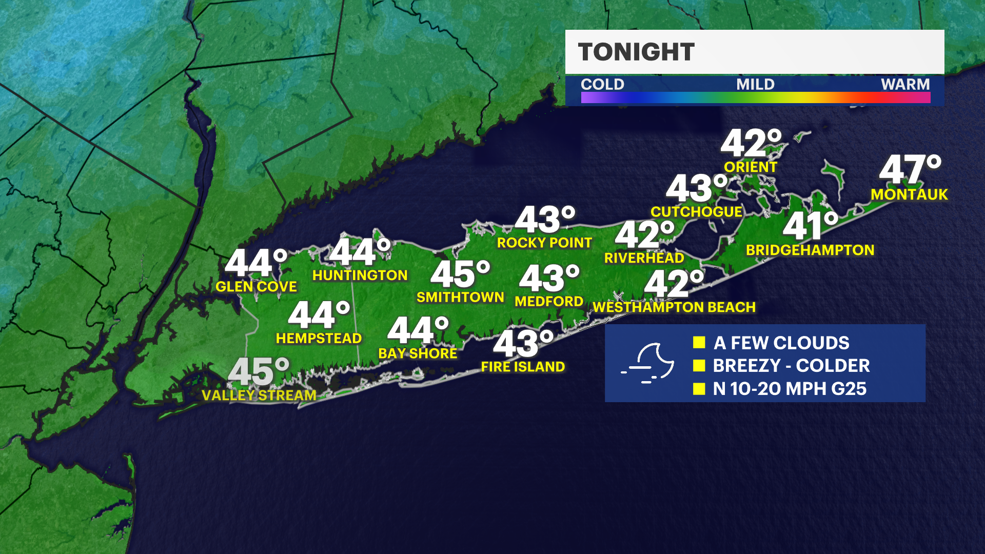 TONIGHT: Mostly clear to partly cloudy and breezy. Chilly with lows around 43 degrees. It will feel like the mid to upper 30s at times early Friday morning thanks to the wind. Wind: north 10-20 mph with gusts slightly higher. The normal average low temperature right now is 47 degrees.