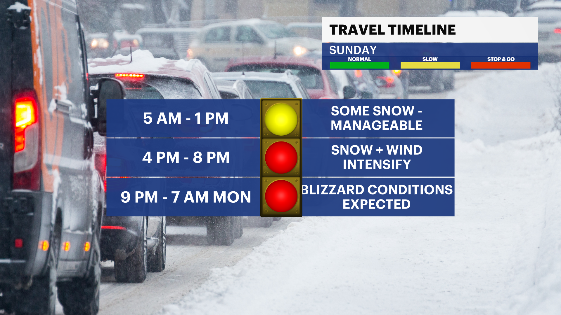 Major travel delays are expected Sunday night into Tuesday. High snow amounts and blowing and drifting snow as high as 5 feet, and it will take time to remove all of the snow to make the roads safe.