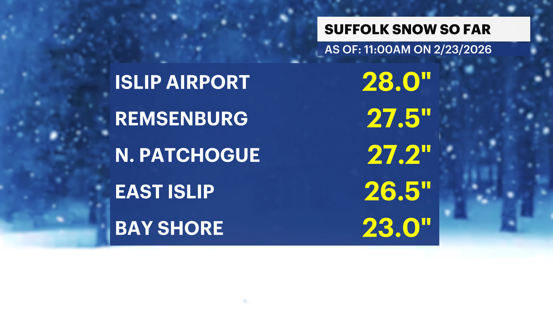 Sixteen to 24 inches of snow is still expected on Long Island as heavy bands of snow have developed and will continue to dump snow through 6 a.m. Monday. Snowfall rates could be 1 to 4 inches per hour.