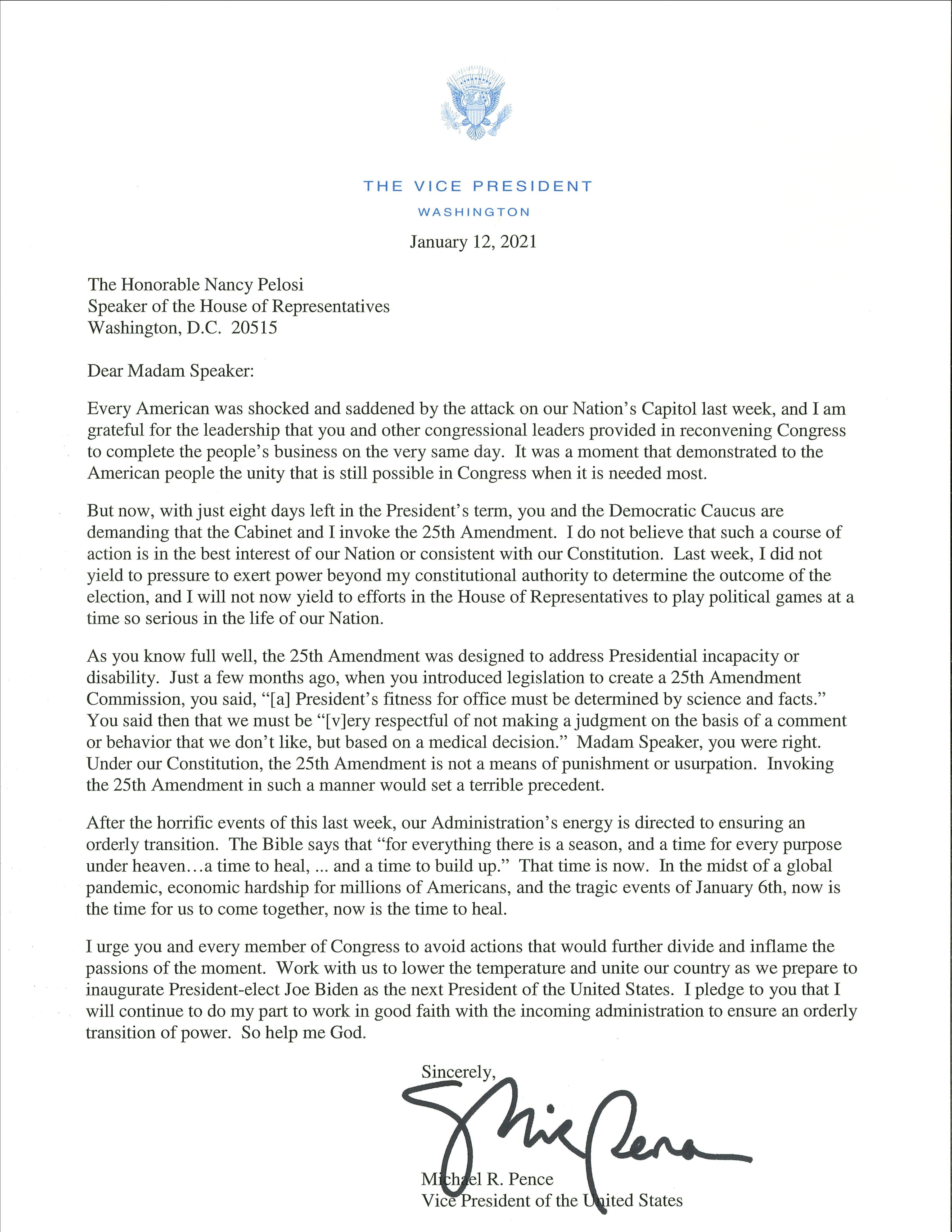In letter to Speaker Nancy Pelosi, Vice President Mike Pence ruled out invoking 25th Amendment to remove President Trump.