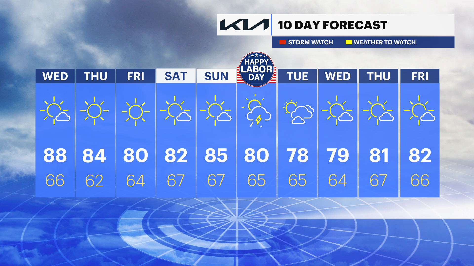 SUNDAY: Mostly sunny and warmer with highs near 85. Lows near 67.