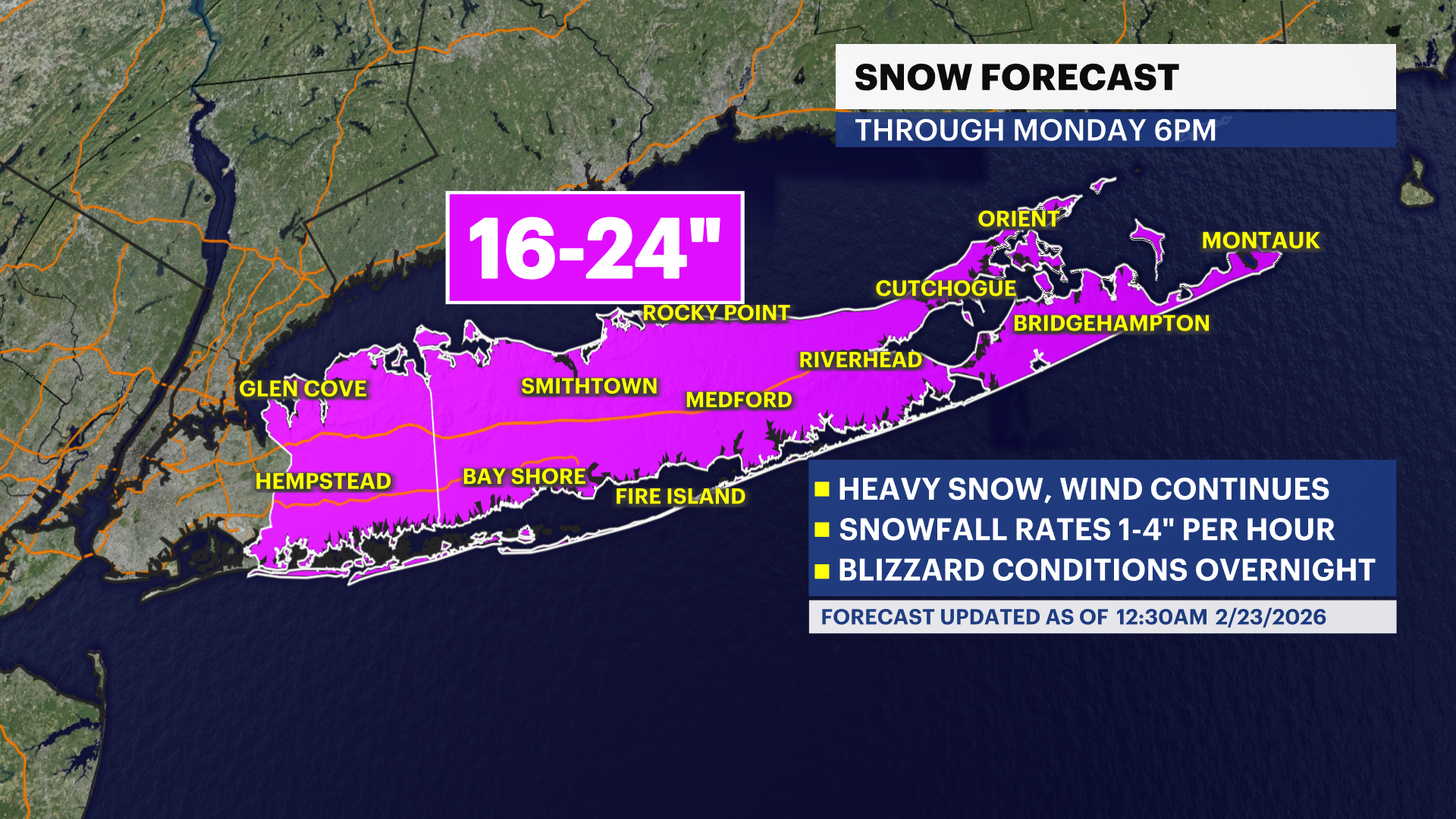 Up to two feet of snow with locally higher amounts and even higher snow drifts due to the wind is still expected on Long Island as heavy bands of snow will continue to dump snow through Monday morning. Snowfall rates will range from 1 to 4 inches per hour.