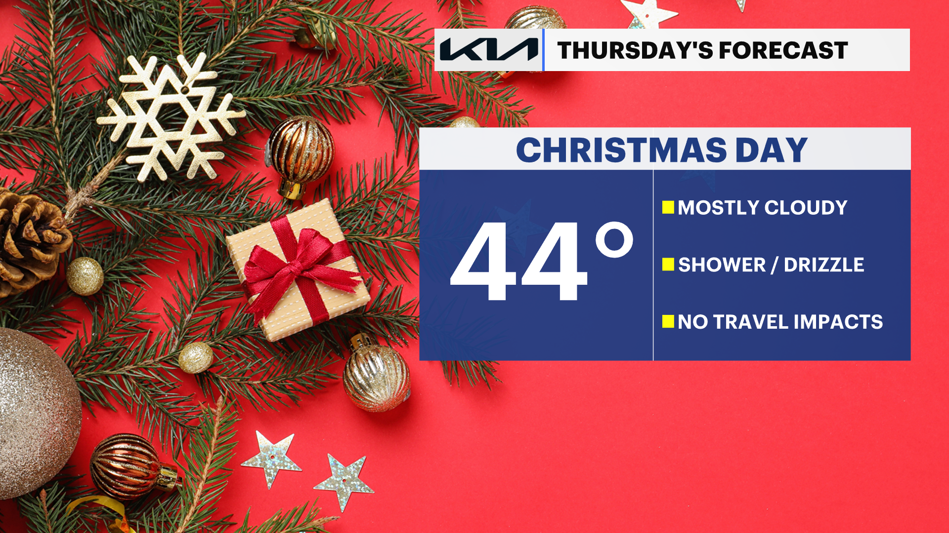Christmas Day: Mostly cloudy, chance of a morning passing snow shower. Chance of an afternoon rain shower or spotty drizzle. with a high near 44. Southwest wind 5 to 15 mph.