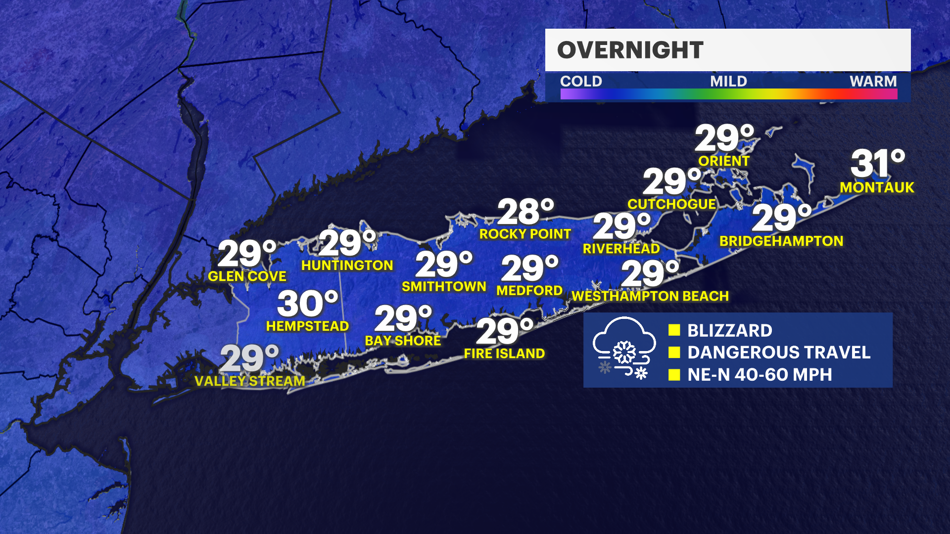 Overnight: Blizzard conditions. Snow, heavy at times. Areas of blowing snow. Dangerous travel. Stay off the roads. Lows 28 to 32. Wind chill values between 15 and 20. Windy with a northeast wind 25 to 35 mph. Winds could gust as high as 55 mph, while some gusts over the East End could be 60 to 70 mph. Power outages likely. A coastal flood warning is in effect until 4 a.m. Monday.