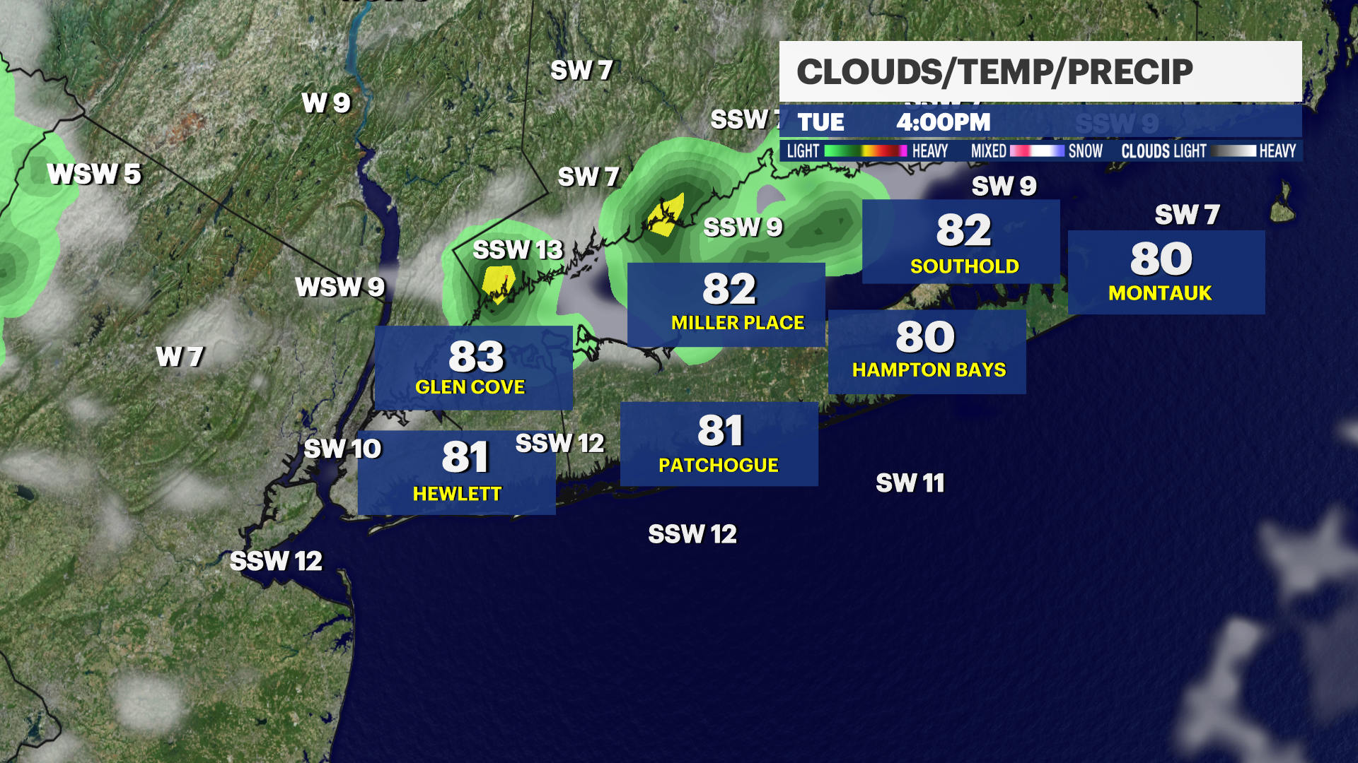 TUESDAY: Warm and humid with sun and clouds. Chance for a few showers and storms during the afternoon. Brief heavy rain is possible. Highs near 83. Warm and muggy at night with lows near 69.