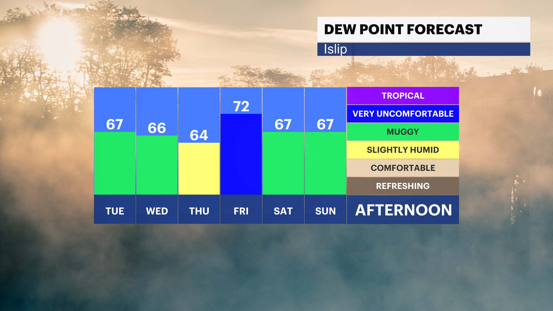 THURSDAY: Mostly sunny, very warm and humid. Highs near 86. Lows near 70.FRIDAY: Sun and clouds. Warm and humid with highs near 86. Lows near 70.