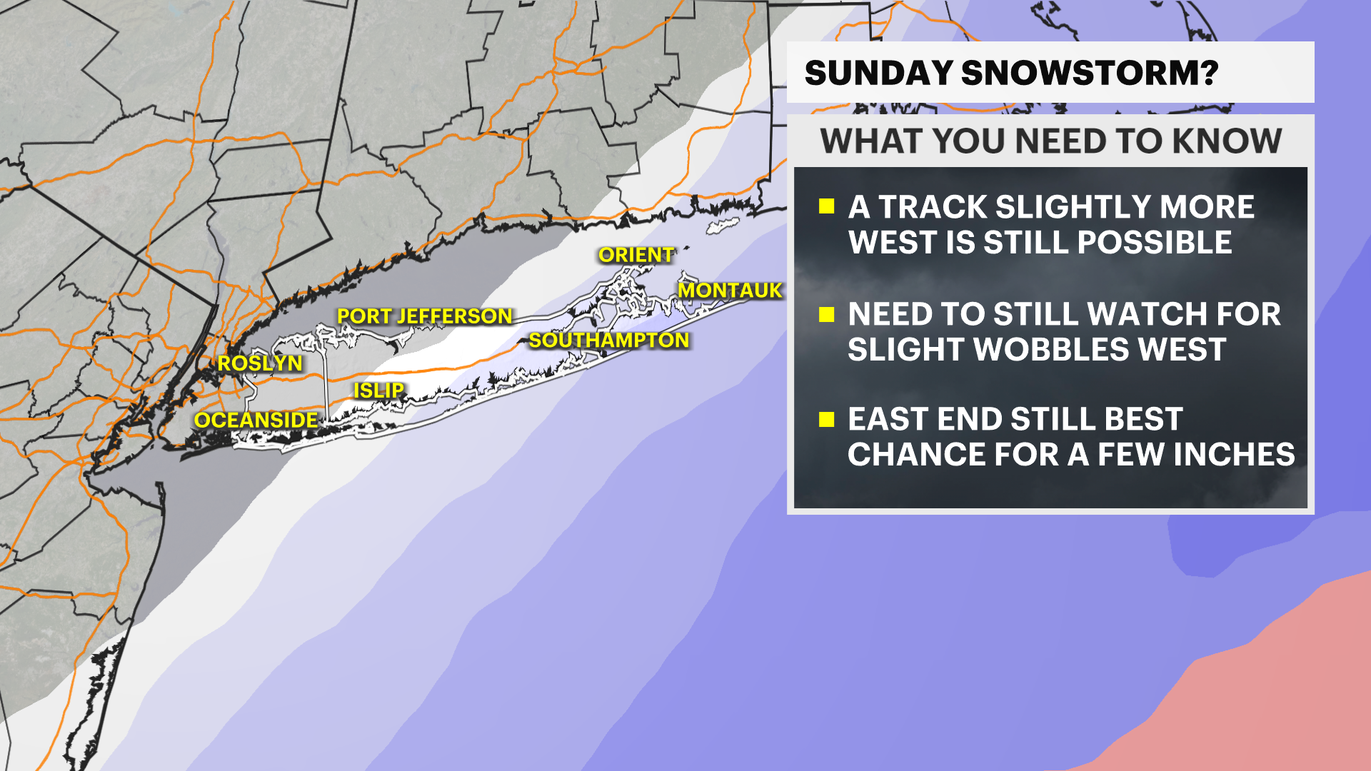 The track of Sunday's storm can still shift slightly east or west. A directional change of 20 to 50 miles would drastically impact snow totals. That said, as of Thursday evening, News 12 is forecasting a trace to 1 inch of snow in Nassau County and western Suffolk County, but up to 3 inches on the East End. If you do not want another major snowstorm for Long Island - and I think we could all use a break following last weekend's storm - recent trends are in your favor. Most computer model guidance has shifted much further east over the last 24+ hours. We do think the far northwestern edge of snow from a big storm positioned around 300 miles southeast of Long Island will still brush parts of Long Island. That is why we are still forecasting some mostly light snow amounts.