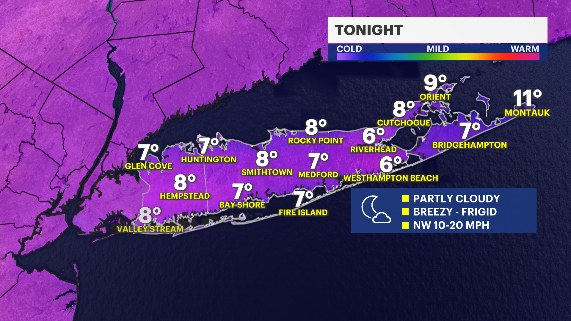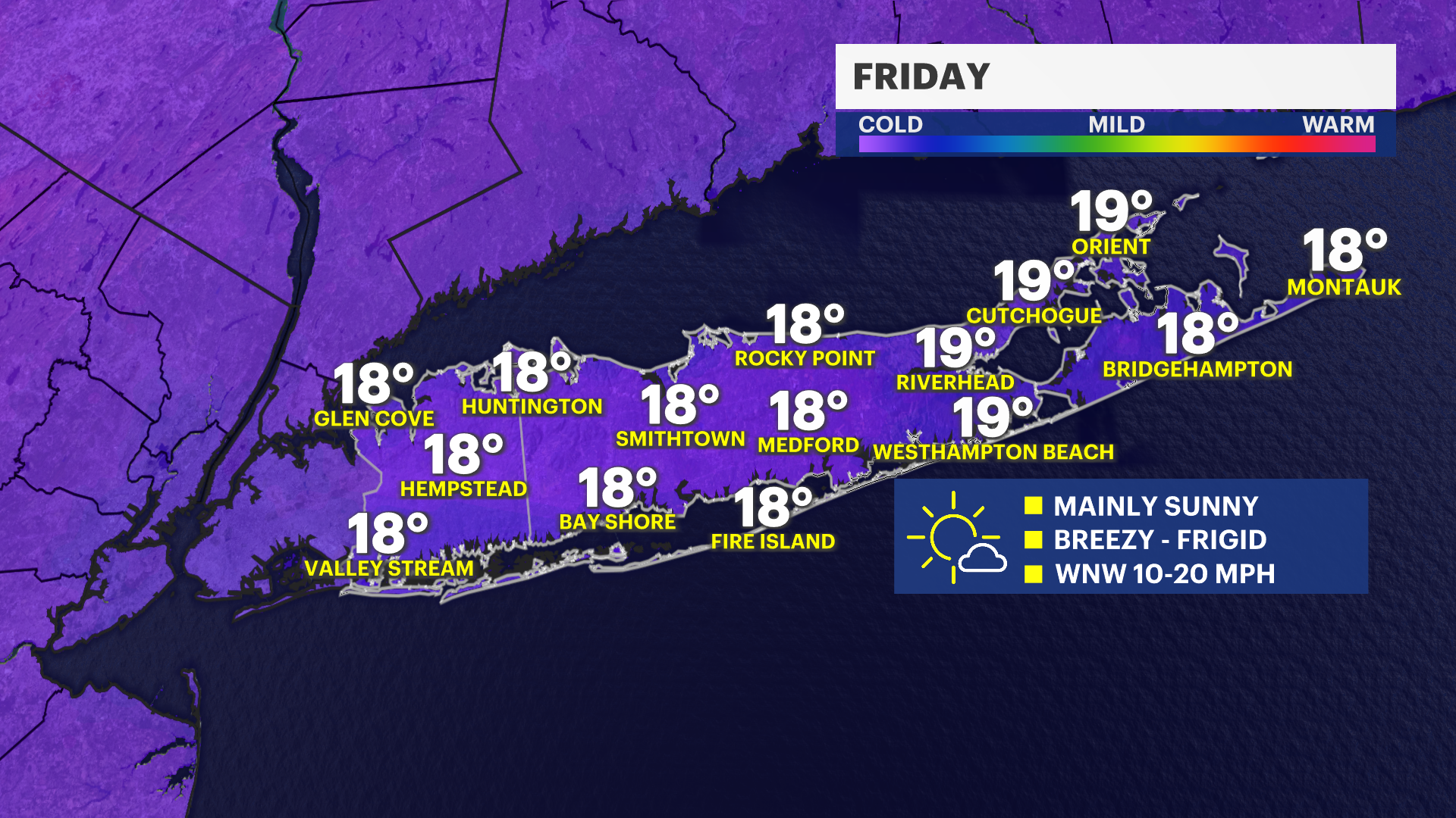 Long Island is also under a "cold weather advisory" through 10 a.m. Friday. Wind chills are around -5 to -15 degrees. A cold weather advisory is issued by the National Weather Service when wind chills are expected to be between -5 degrees and -19 degrees within 24 hours. This is the coldest feeling air of the week, with actual low temperatures in the upper single digits on Friday morning and high temperatures in the teens on Friday afternoon. It will stay dry with a partly cloudy sky, but there will be a biting breeze out of the northwest, around 10 to 20 mph. Stay warm! Frostbite and other cold-weather health issues can begin to appear in as little as 15 minutes.