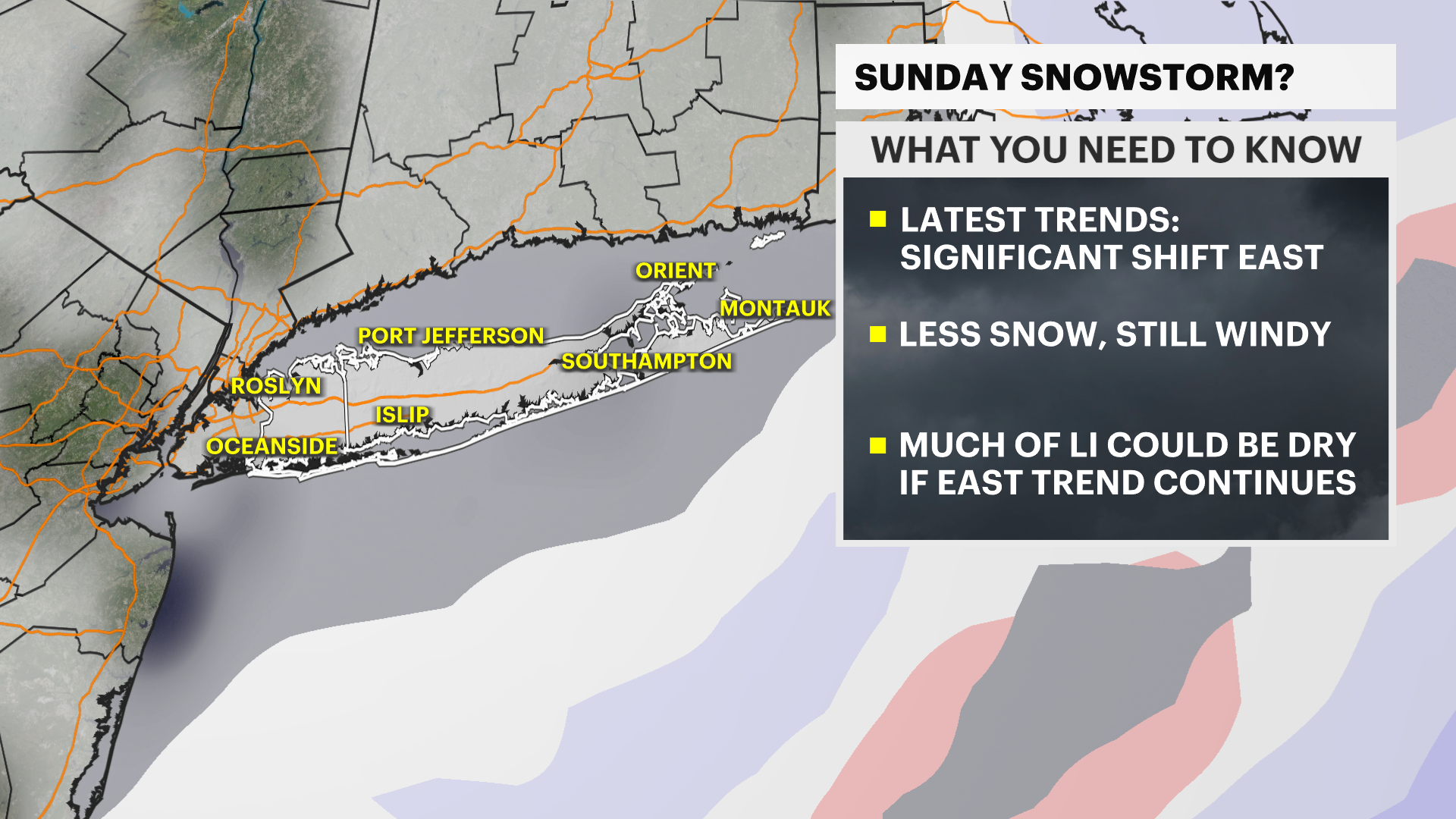 It is certainly plausible that this east trend continues. If that is the case, most of Long Island would stay dry with perhaps a couple of snow showers or flurries. We are just not at the time to make a confident call on that yet. The storm is still more than 48 hours from being anywhere near us, and we will have tweaks to the forecast as newer and better information comes in.