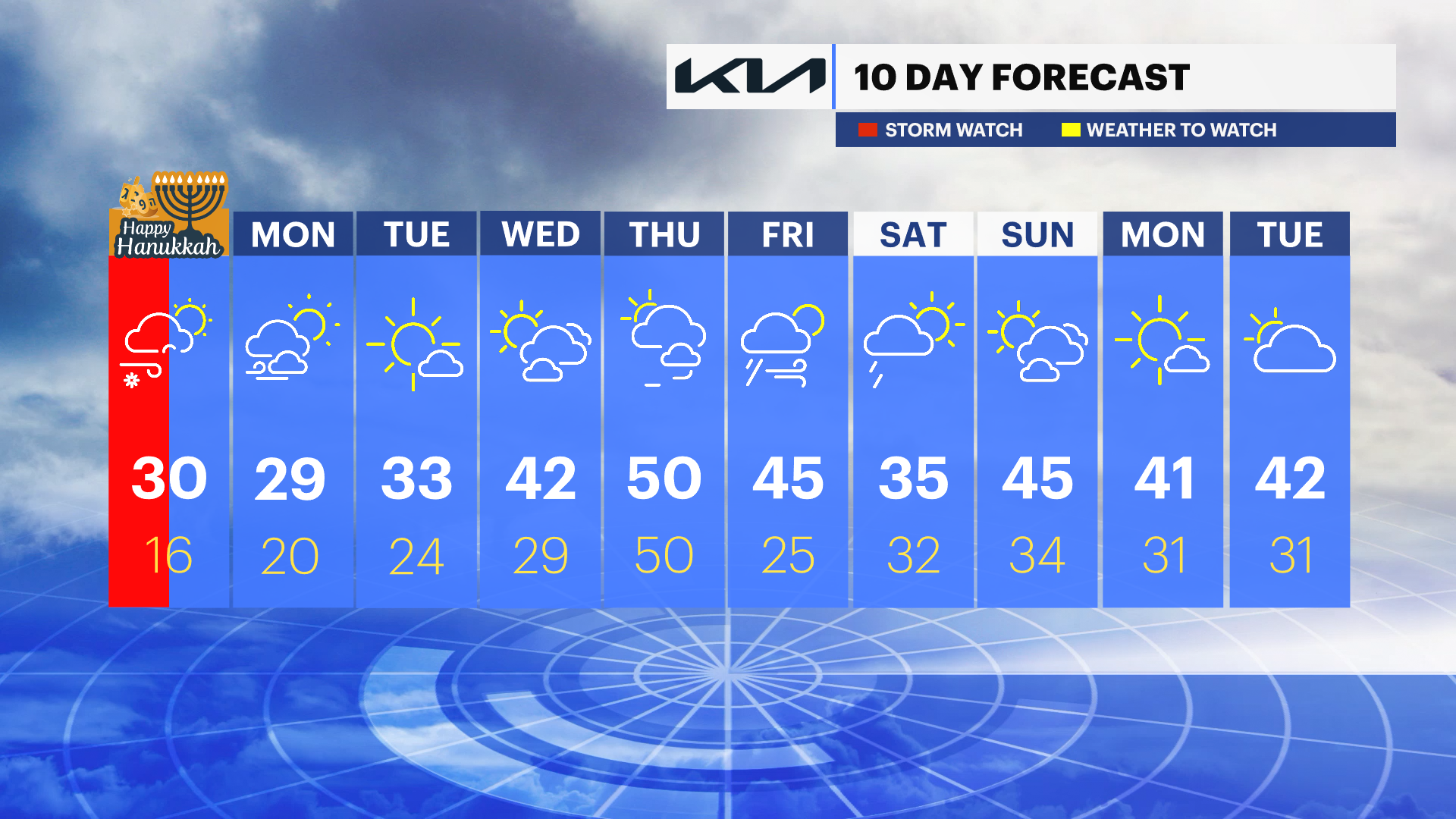 SUNDAY: STORM WATCH (MORNING): Steady snow tapers off between around 8 a.m. and 10 a.m. A few lingering snow showers and flurries can still be possible after through around noon. Snow totals: two to four inches of snow are expected. There will be a moderate cleanup to have to do on Sunday. The snow is not going to melt right away. Highs will be around 33 degrees, but mostly be in the 20s by Sunday afternoon. It will feel frigid - like the teens quickly and like the single digits in the evening and at night. If you have Hanukkah or any plans Sunday afternoon or evening, please still use extreme caution. Icy roads will still be likely. Lows will be near 16 degrees, but it will feel like the single digits.
