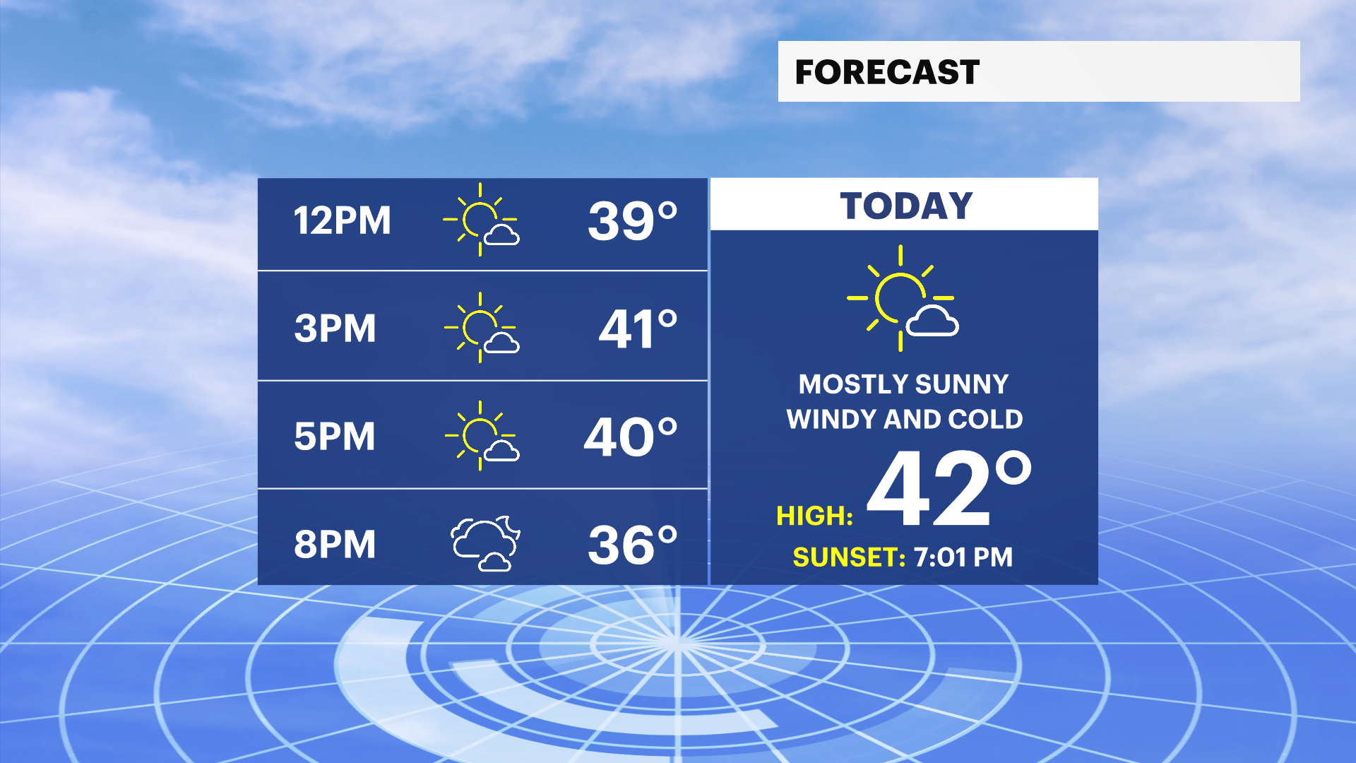 Tuesday: Mostly sunny. Highs near 43 degrees. Breezy. Westerly winds 15 to 30 mph.