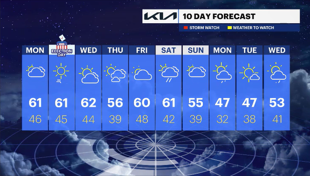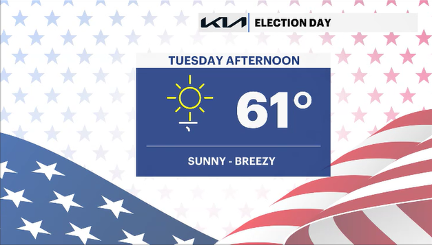TUESDAY (ELECTION DAY): Sunny, breezy with winds blowing from 10-20 mph in the afternoon. Highs in the low 60s. Lows in the mid-40s.