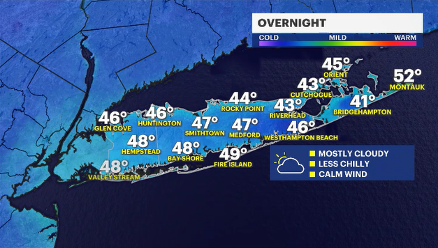 OVERNIGHT: Mostly cloudy, not as chilly, calm wind. Lows in the mid-40s.