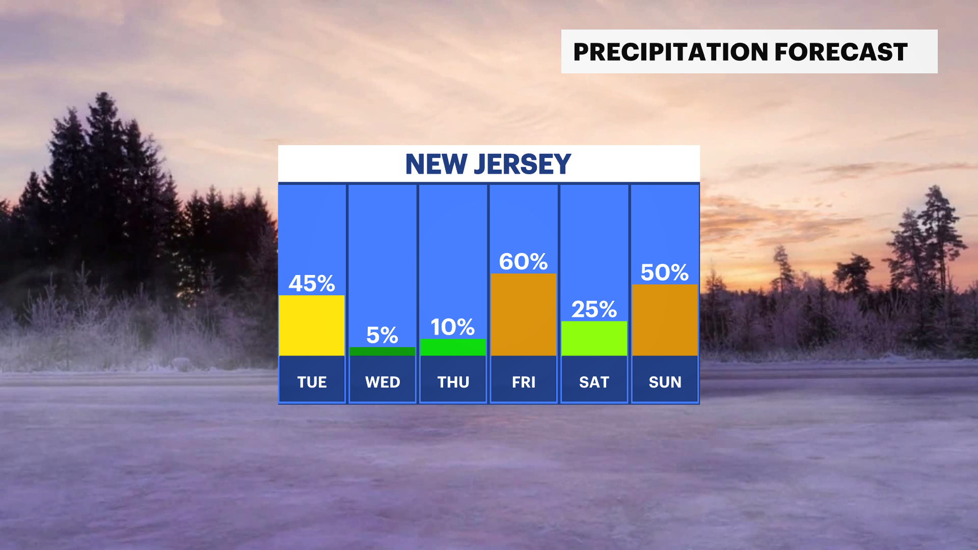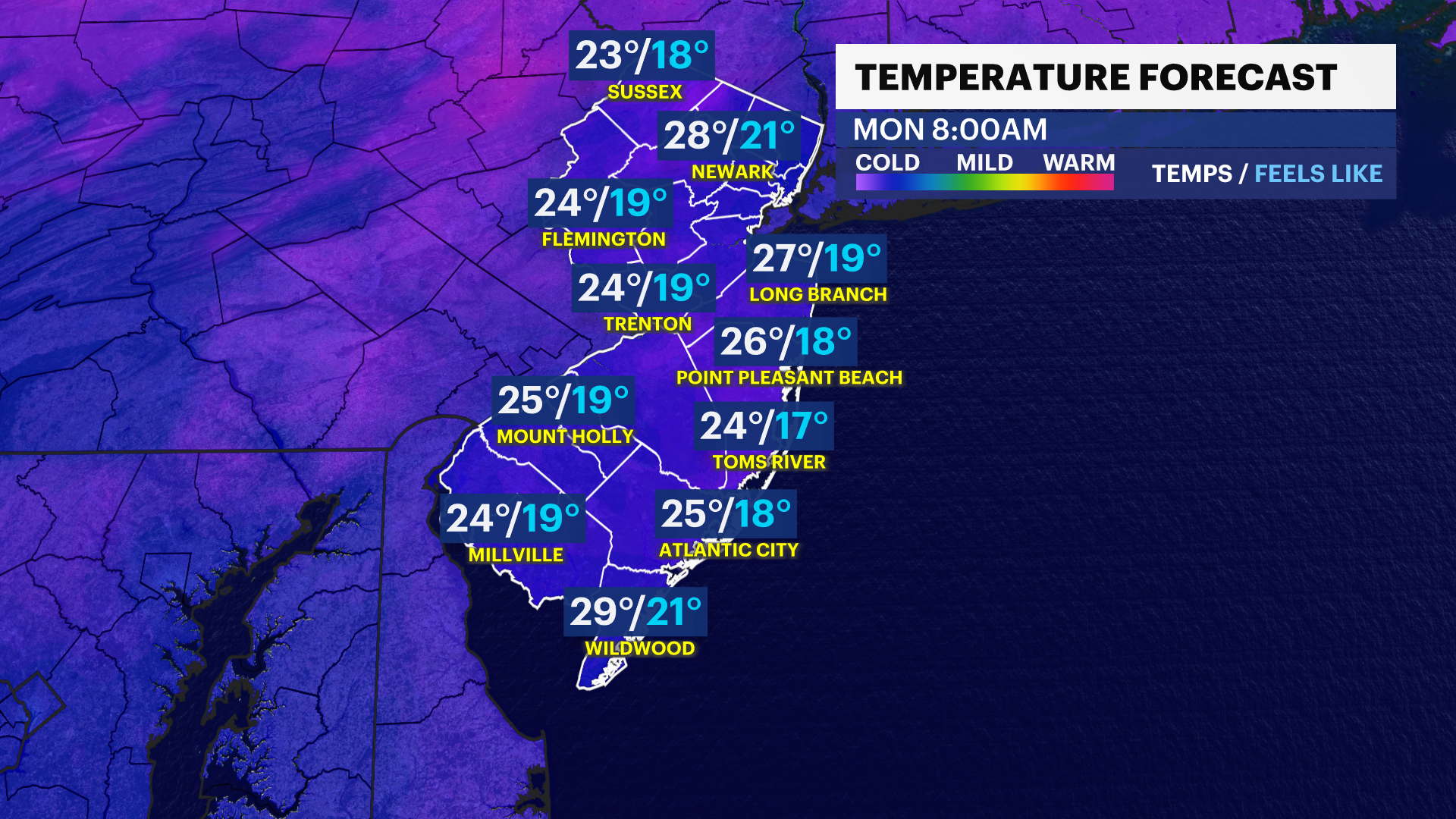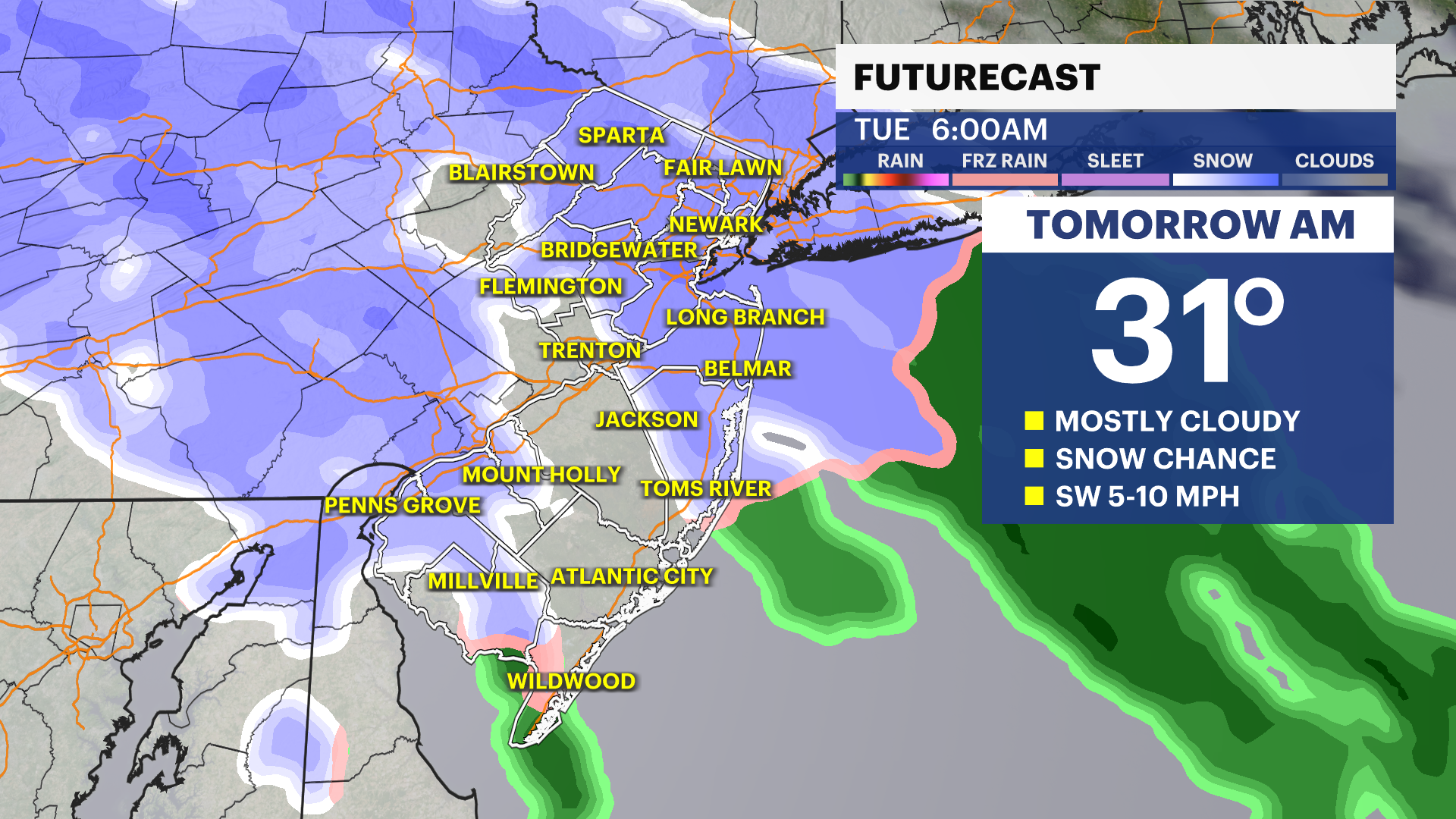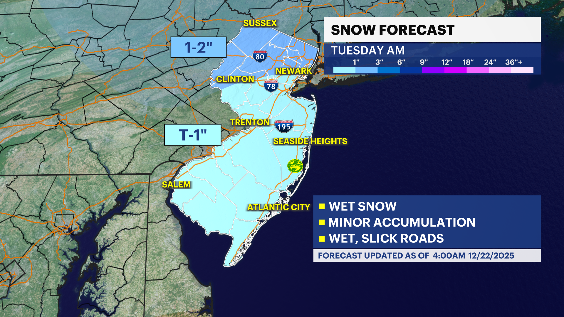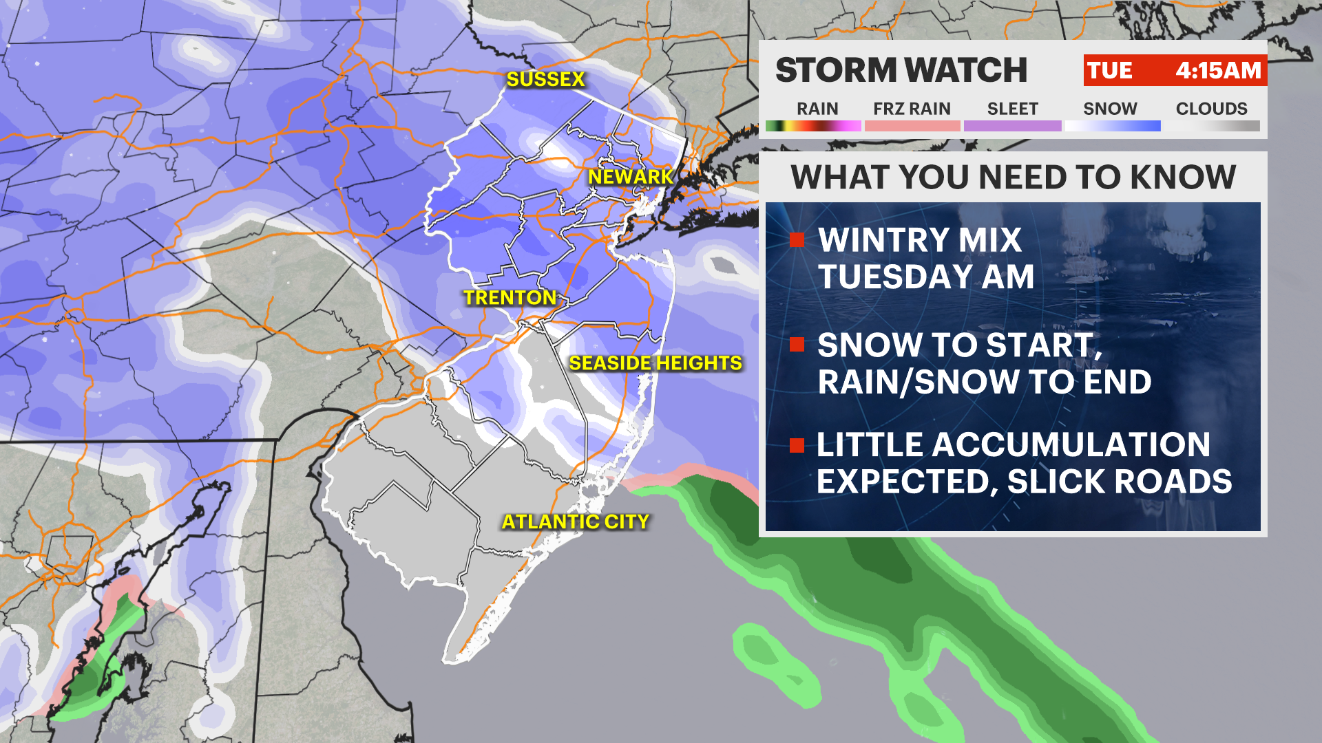 By the overnight, clouds settle in, and snowflakes appear across northwestern areas of the state. North of I-80 and as south as I-78 have the best chance for 1-2" of snow. The rest of the state could see lesser amounts, trace to an inch. A mix of rain to the end could make for slicker roads and untreated surfaces.