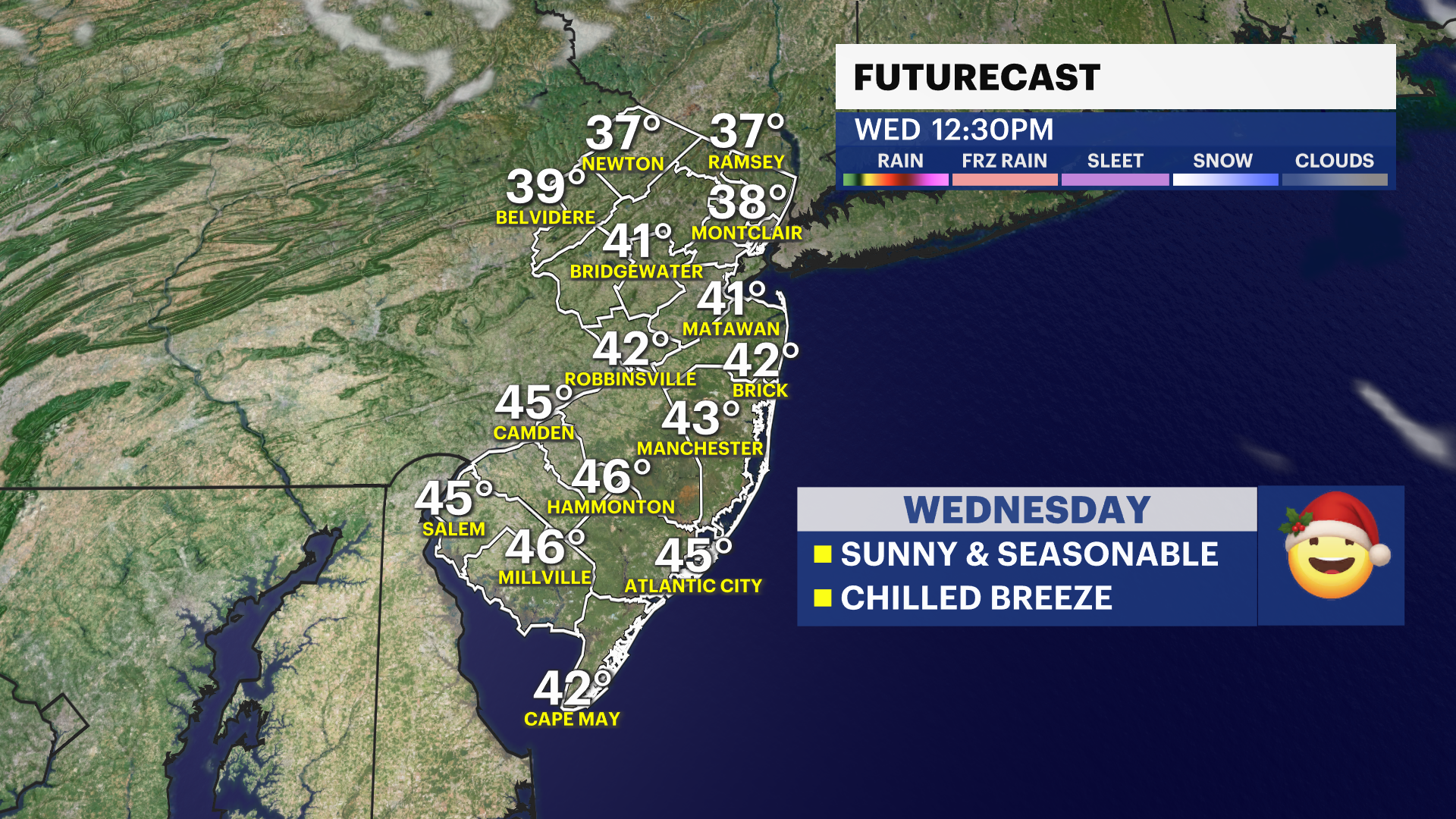 WEDNESDAY/CHRISTMAS EVE: Partly sunny. Great for traveling. Highs near 47. Overnight lows near 30.