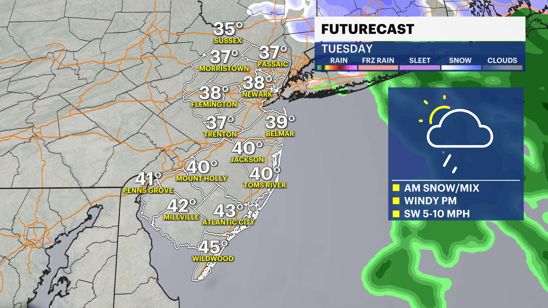 TUESDAY: Cloudy with light snow, rain mix south of I-78. Snow slicks roads and sidewalks earlier morning before rain mix around noon. Higher elevations, 1-2" areas south trace to an inch. Breezy afternoon. Highs near 35-41. Overnight lows near 29.