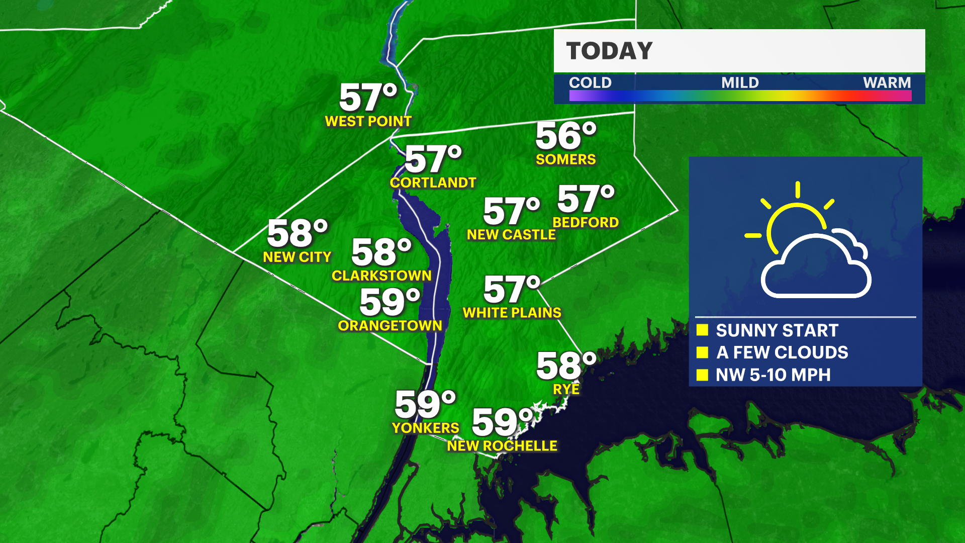 Sunny to start, then a few clouds. Winds NW at 5-10 mph. Highs in the upper 50s.